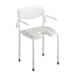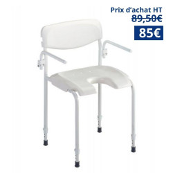 Chaise de douche en acier thermolaqué, stable et réglable, avec accoudoirs relevables et siège hygiénique pour plus de confort et de sécurité.